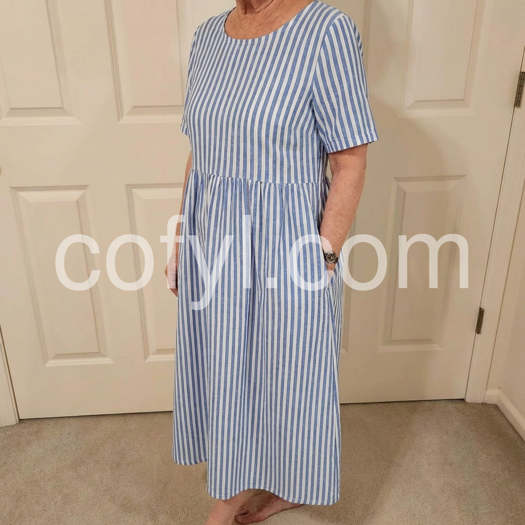 This dress embodies the essence of effortless Mediterranean chic. The classic vertical blue-and-white stripe print evokes a fresh, airy sensibility, perfect for sunlit escapes.
