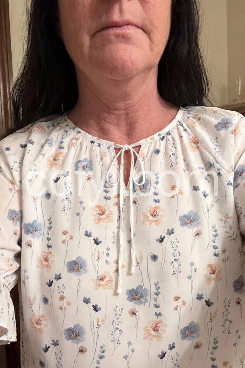 This loose-fit top features a delicate floral print on a soft white base. Keyhole neckline with front tie adds a romantic touch. Three-quarter ruffle sleeves enhance the boho charm. Lightweight and perfect for spring or summer. Effortlessly stylish with jeans or skirts.