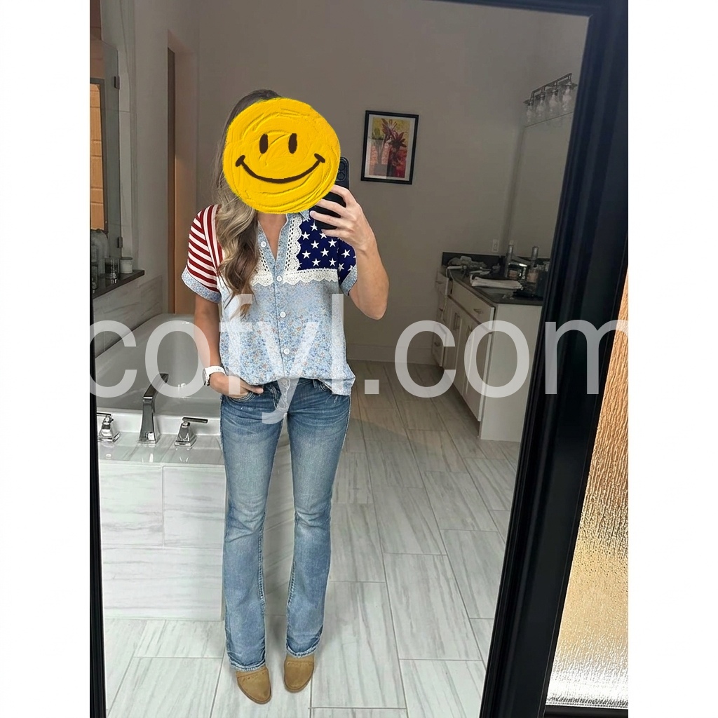 This short-sleeve shirt features a bold American flag design on the shoulders with lace trim. Light blue floral print body and front button closure. Relaxed fit with side pockets for comfort. Perfect for summer holidays or casual outings. Patriotic flair meets feminine charm.