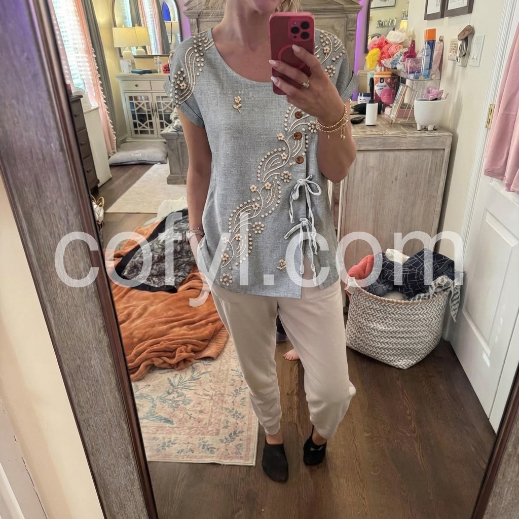 This blouse blends artisanal detail with feminine charm. The muted gray base, adorned with delicate floral and dot embroidery, evokes timeless sophistication.