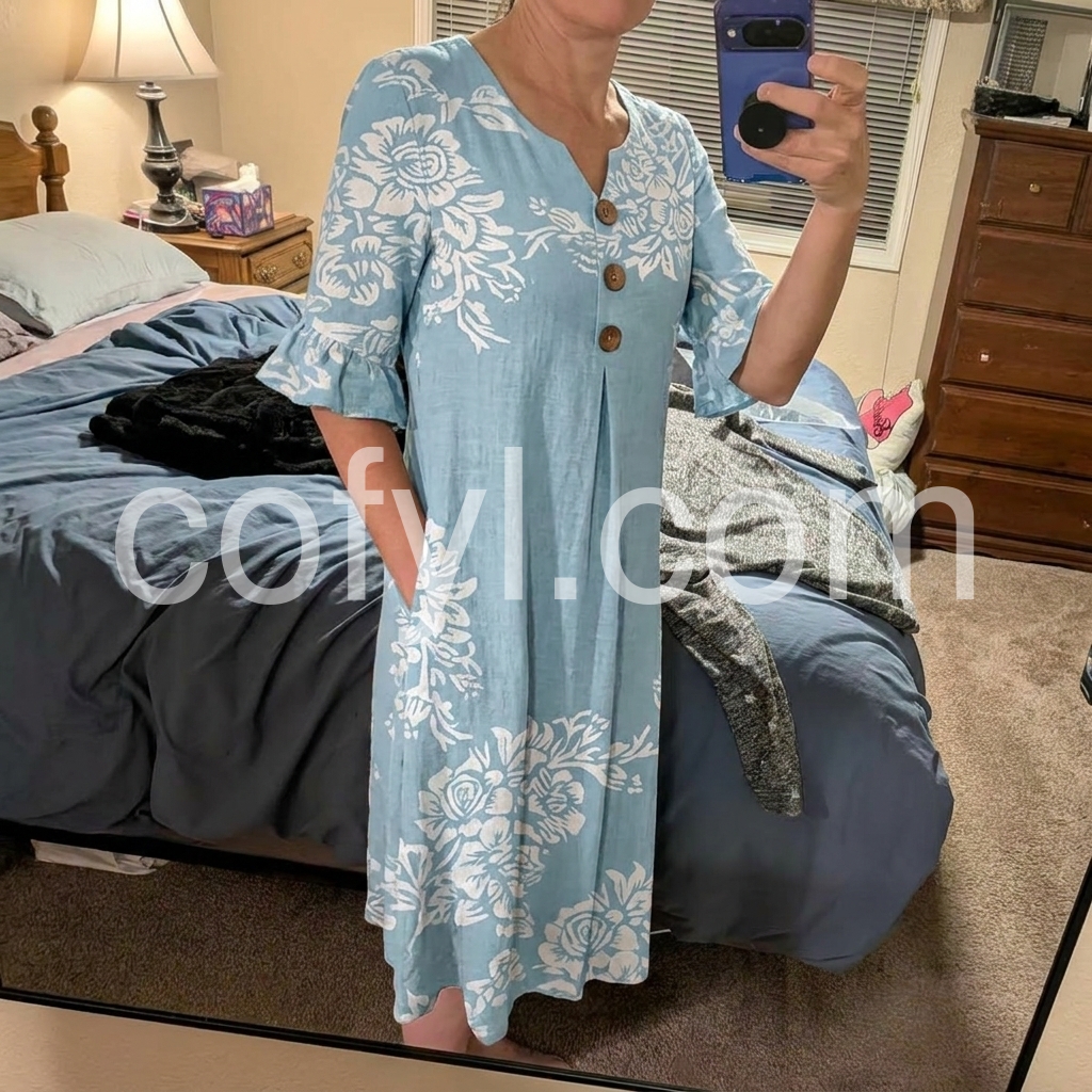 Blue Floral Ruffle Sleeve Button Linen Maxi Dress