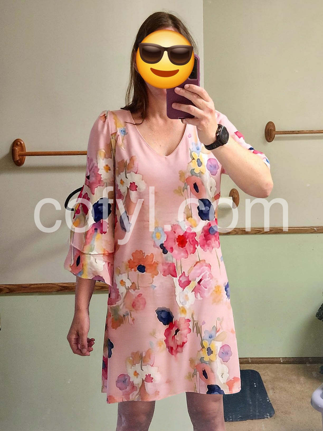 Style# 1544501Embrace soft romance and effortless style in this Pink Watercolor Floral 3/4 Sleeve Mini Dress , a dreamy mini dress that captures the beauty of blooming spring. Crafted from lightweight, flowing fabric—likely chiffon or rayon blend—this dress features a delicate watercolor-inspired floral print in vibrant shades of pink, coral, navy, yellow, and white, creating a painterly effect across the soft blush base. The flattering V-neckline adds a touch of elegance, while the short ruffle sleeves bring playful volume and feminine charm. A relaxed, A-line silhouette ensures comfort and ease, making it perfect for casual days, brunches, or warm-weather outings. Paired here with layered bracelets and a pearl necklace, it exudes boho-chic appeal. Ideal for beach trips, garden parties, or weekend strolls, this dress brings a sense of lightness, joy, and timeless femininity to your wardrobe. Let this floral mini dress turn every moment into a gentle celebration of color and style.