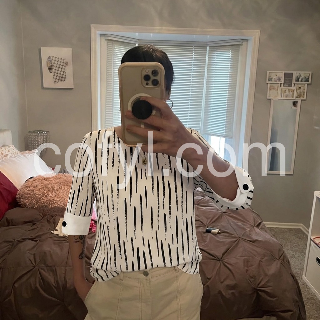 Wore this out to brunch and got so many compliments. The brush stroke stripes are unique and slimming. The folded cuffs with the black button are a really cute detail. Highly recommend!