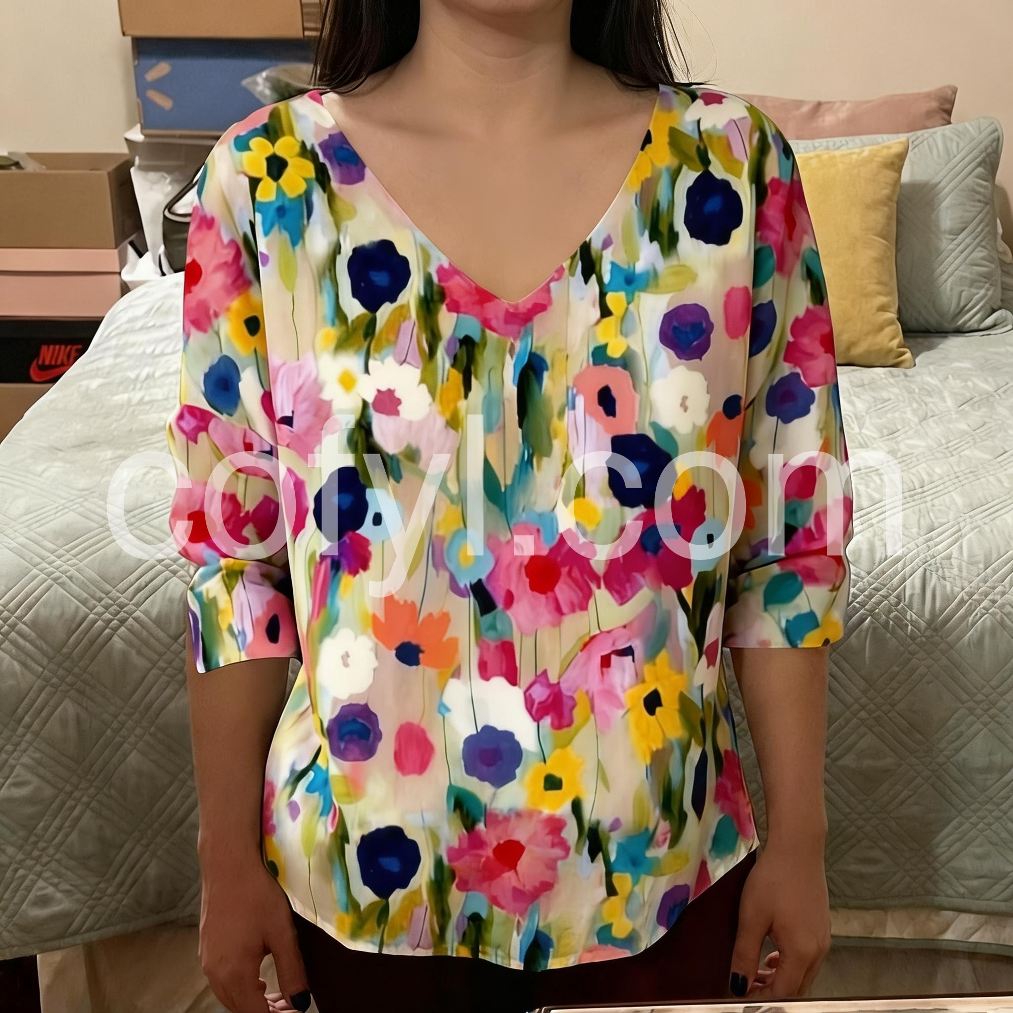This flowy top features a colorful watercolor floral print on a soft beige base. Deep V-neckline and three-quarter sleeves with rolled cuffs. Lightweight fabric perfect for warm weather. Ideal for casual wear or beach outings. Effortlessly stylish and full of summer spirit.