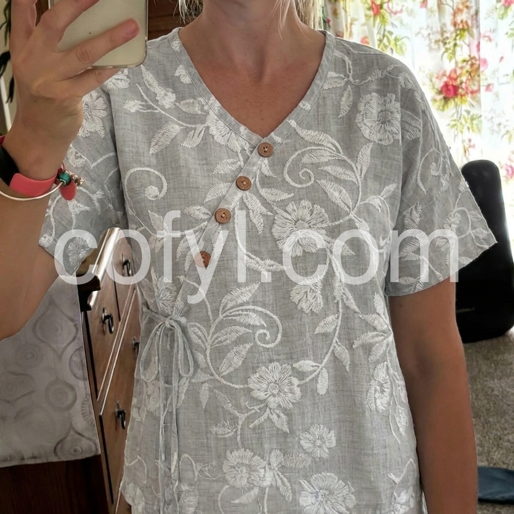 This short-sleeve top features a soft gray base with white floral print. V-neckline with wooden buttons and side tie detail. Relaxed fit for all-day comfort. Lightweight fabric perfect for casual wear. Ideal for pairing with jeans or pants.