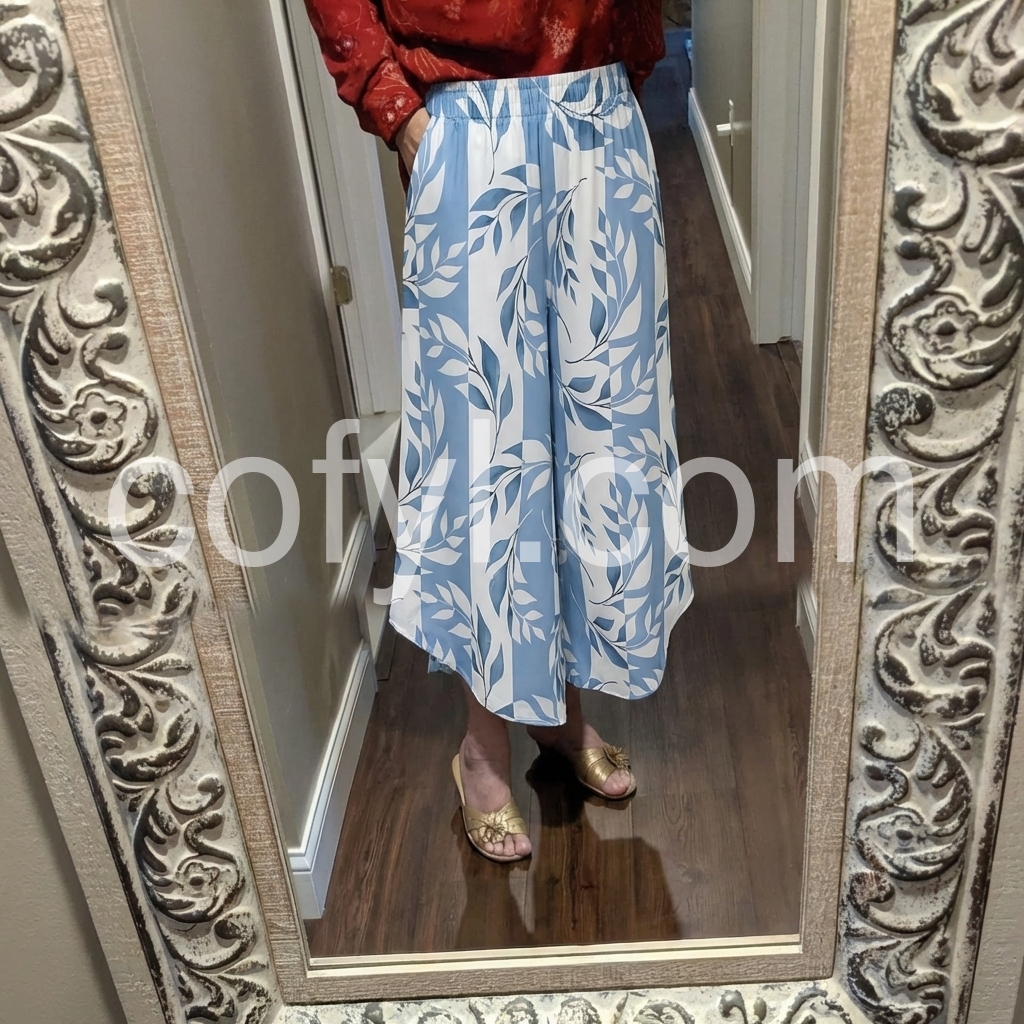These flowy culottes feature a soft blue and white leaf pattern with a relaxed fit. Elastic waistband for comfort and ease of wear. Wide-leg design with a slightly asymmetrical hem. Lightweight fabric perfect for warm weather. Ideal for beach outings or casual summer days.