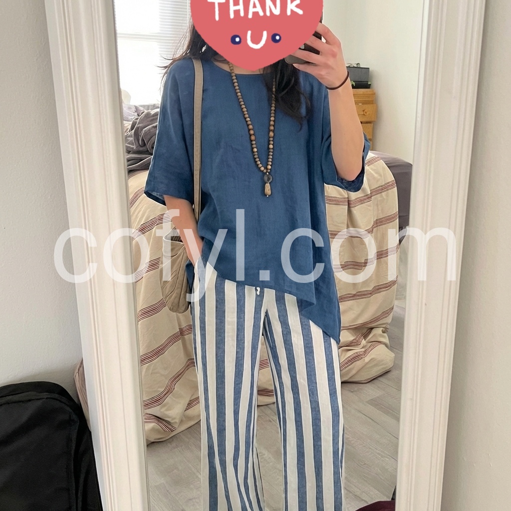This relaxed outfit features a navy asymmetrical tunic with a flowing silhouette. Paired with wide-leg pants in bold blue and white stripes. Lightweight fabric perfect for warm days. Ideal for casual outings or beachwear. Effortlessly stylish and comfortable.