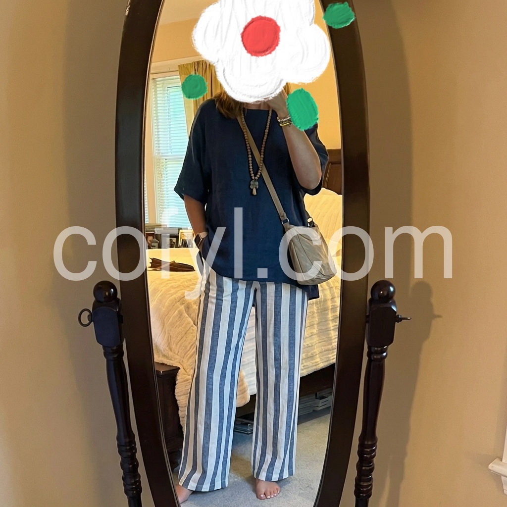 Love the casual elegance of this outfit. The navy blue top pairs so nicely with the blue and white striped bottoms. It is very versatile; I wear it as a lounge outfit at home and out for casual dinners.