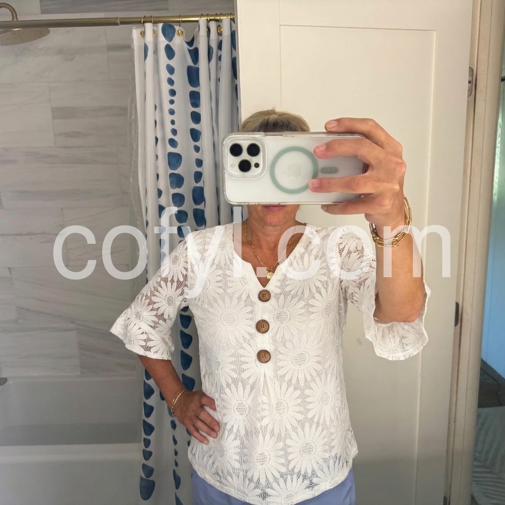 The V-neckline, three wooden accent buttons, and flared ruffle cuffs add refined, vintage-inspired detail, while the relaxed fit ensures all-day comfort.
