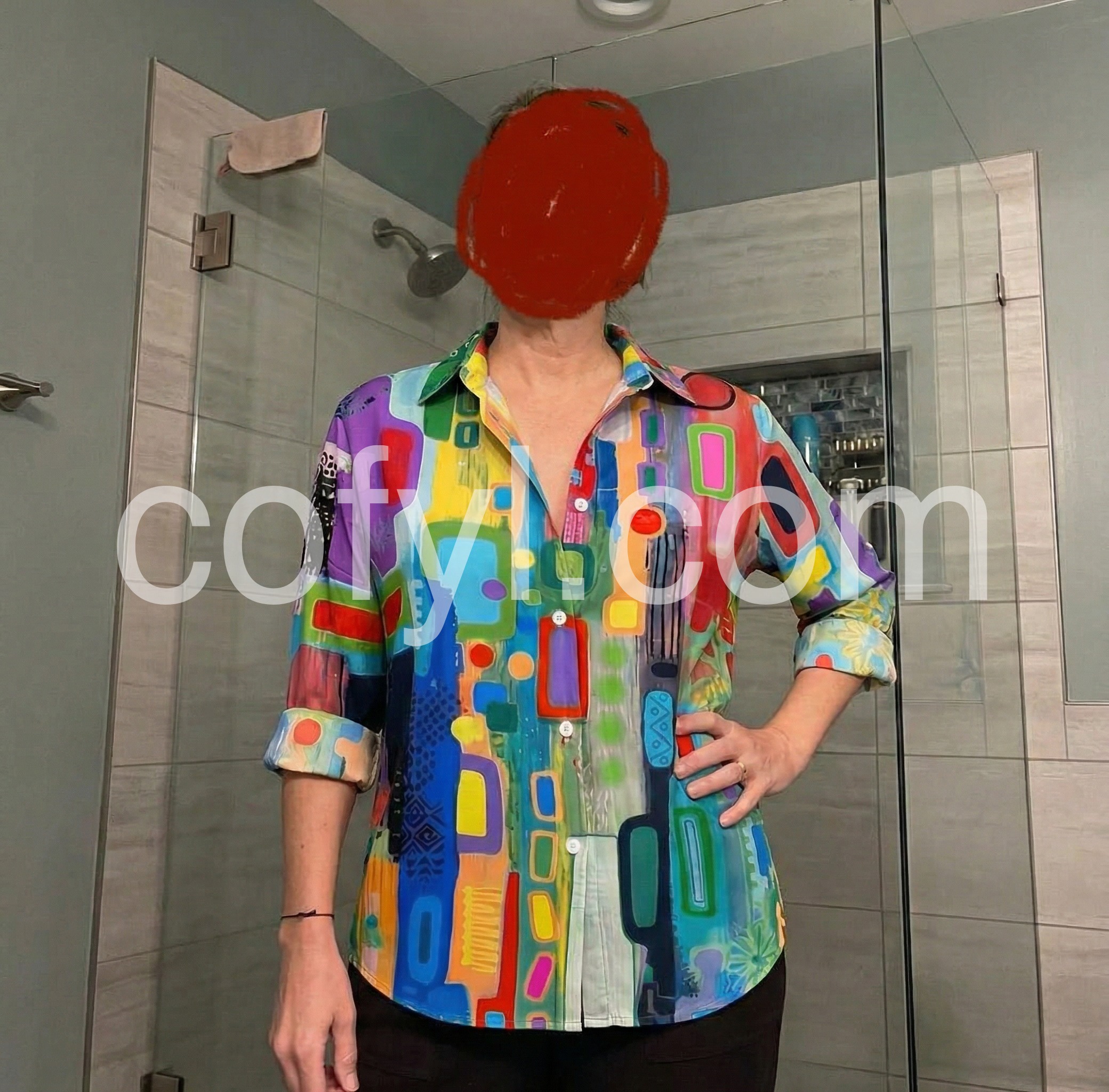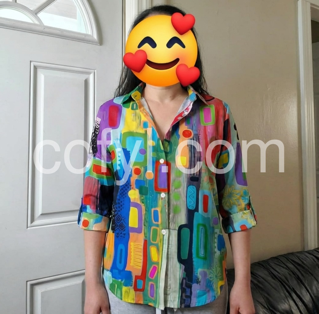 I love this top.I’m loving the colorful geometric design on this blouse. It’s the perfect way to add a stylish, modern touch to my wardrobe.