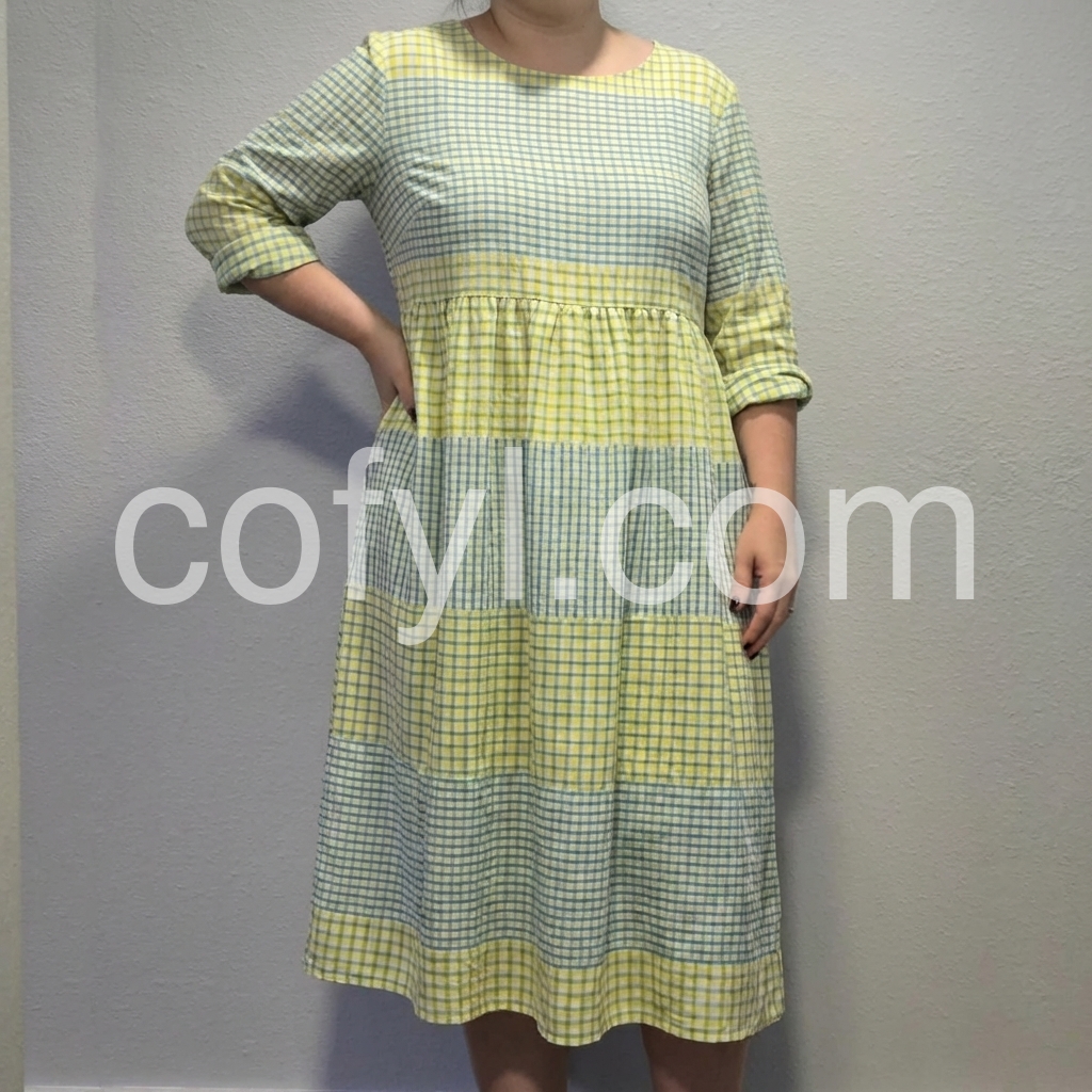 This midi dress celebrates effortless summer style with a playful color-block gingham design. The round neck, 3/4 sleeves, and tiered skirt offer a relaxed, flowy fit.