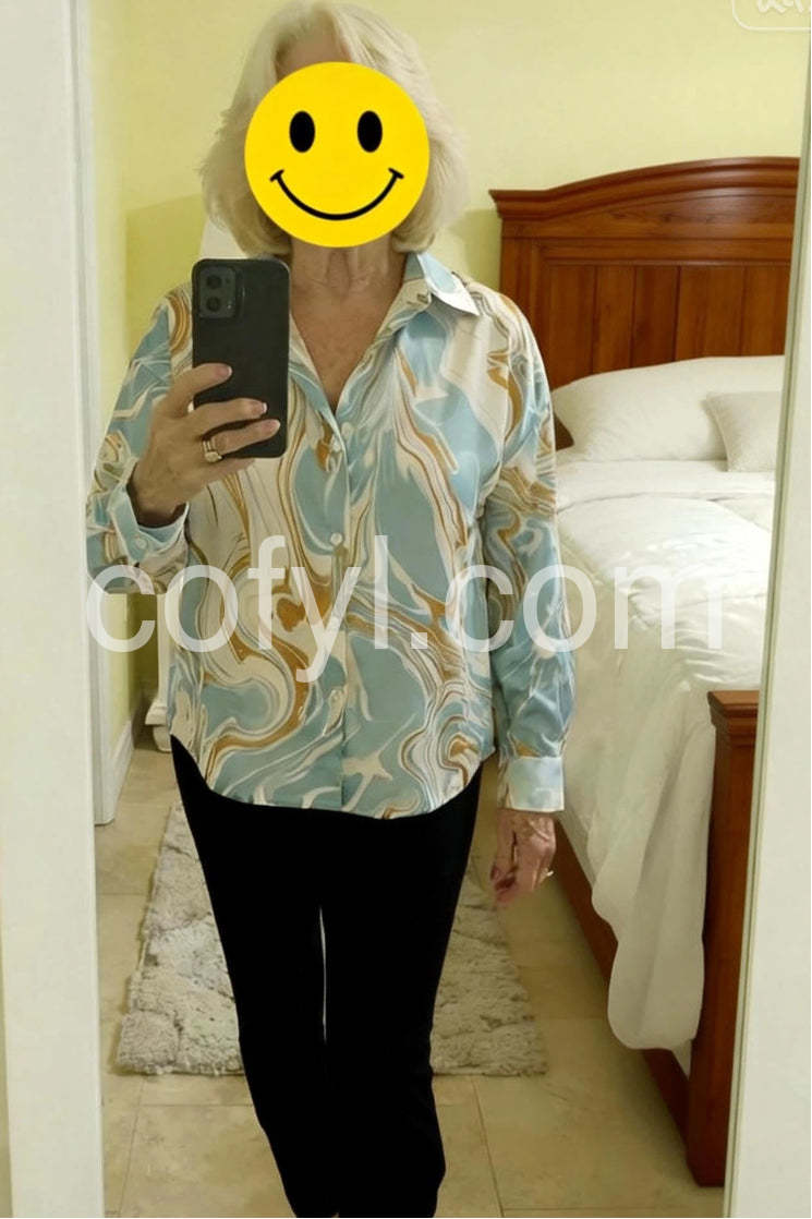 Such a pretty blouse. I love layering necklaces with it unbuttoned at the top just like the model. The material is very forgiving and comfortable for all-day wear. The gold and blue swirl design is eye-catching but not overwhelming.
