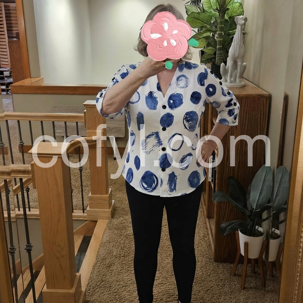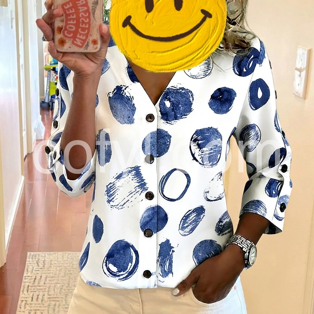This V-neck blouse features a bold blue abstract dot print on a white background. Button-down front with three-quarter sleeves and button cuffs. Relaxed fit perfect for casual wear. Ideal for pairing with jeans or shorts. Modern and eye-catching design.