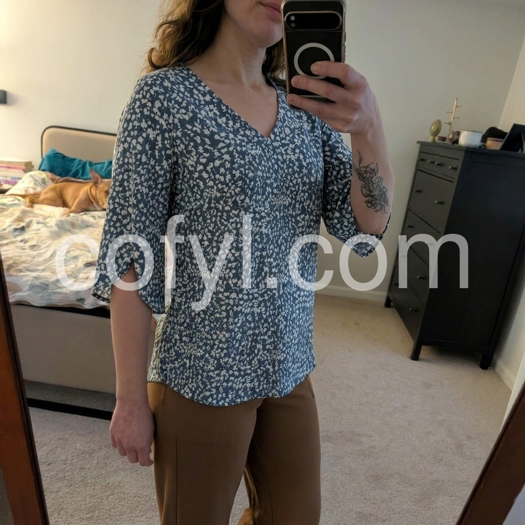 Style# 1548360From a design perspective, this blouse reimagines the everyday floral top with modern, flattering details. The delicate ditsy floral print on a muted blue base avoids the overwhelming “busy” feel of large patterns, while the split three-quarter sleeves add movement and a relaxed, breezy touch. The V-neckline elongates the silhouette, balancing the wide sleeves and keeping the look balanced.
