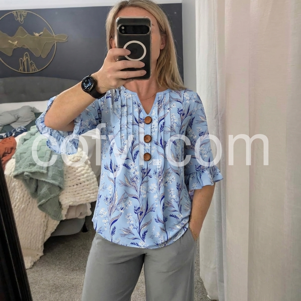 The V-neck, pleated front, and ruffle cuffs add refined detail, while the relaxed fit offers all-day comfort.
