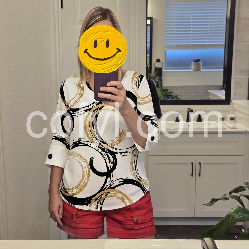Crafted from smooth, drapey fabric, it boasts a striking print of overlapping black and gold brushstroke circles on a crisp white base, blending modern artistry with sophisticated style. The fabric’s wrinkle-resistant quality makes it ideal for busy schedules.