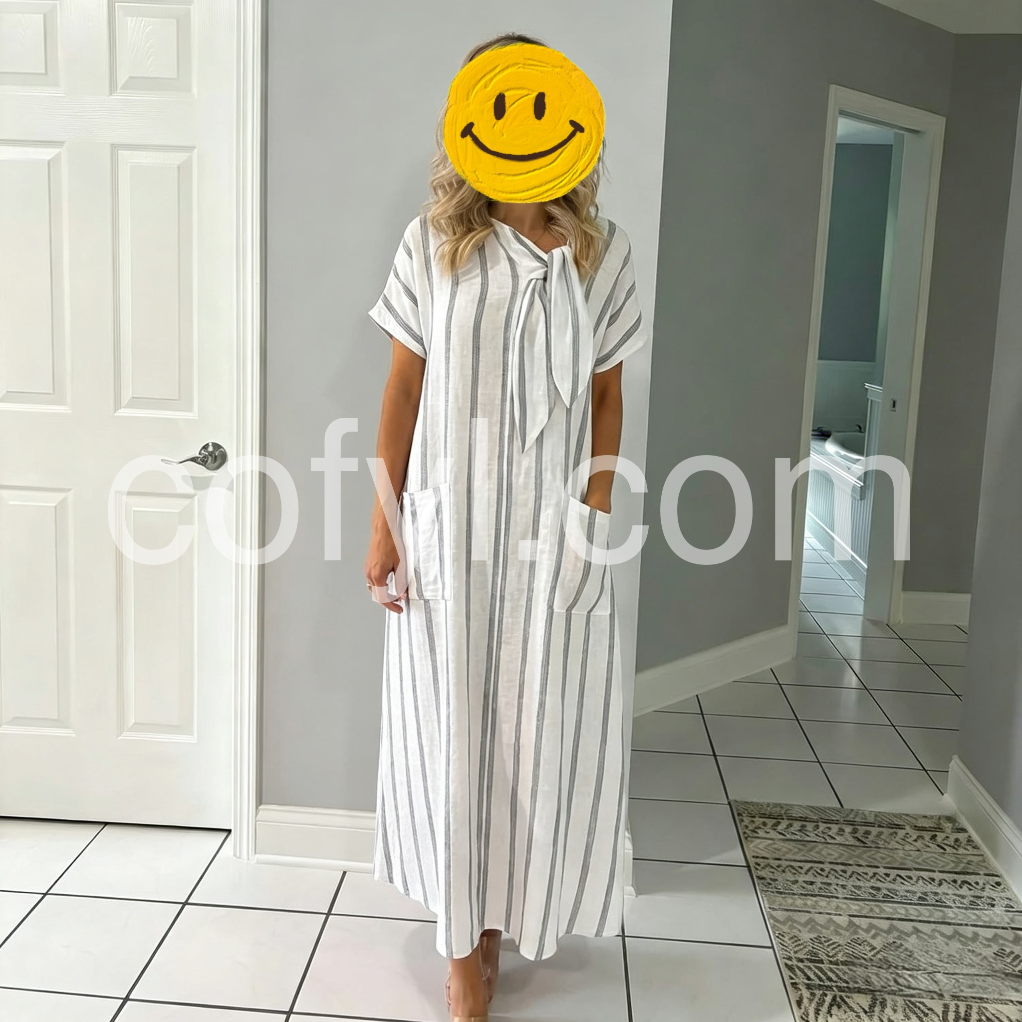 Gray White Stripe Tie Neck Pocket Maxi Dress