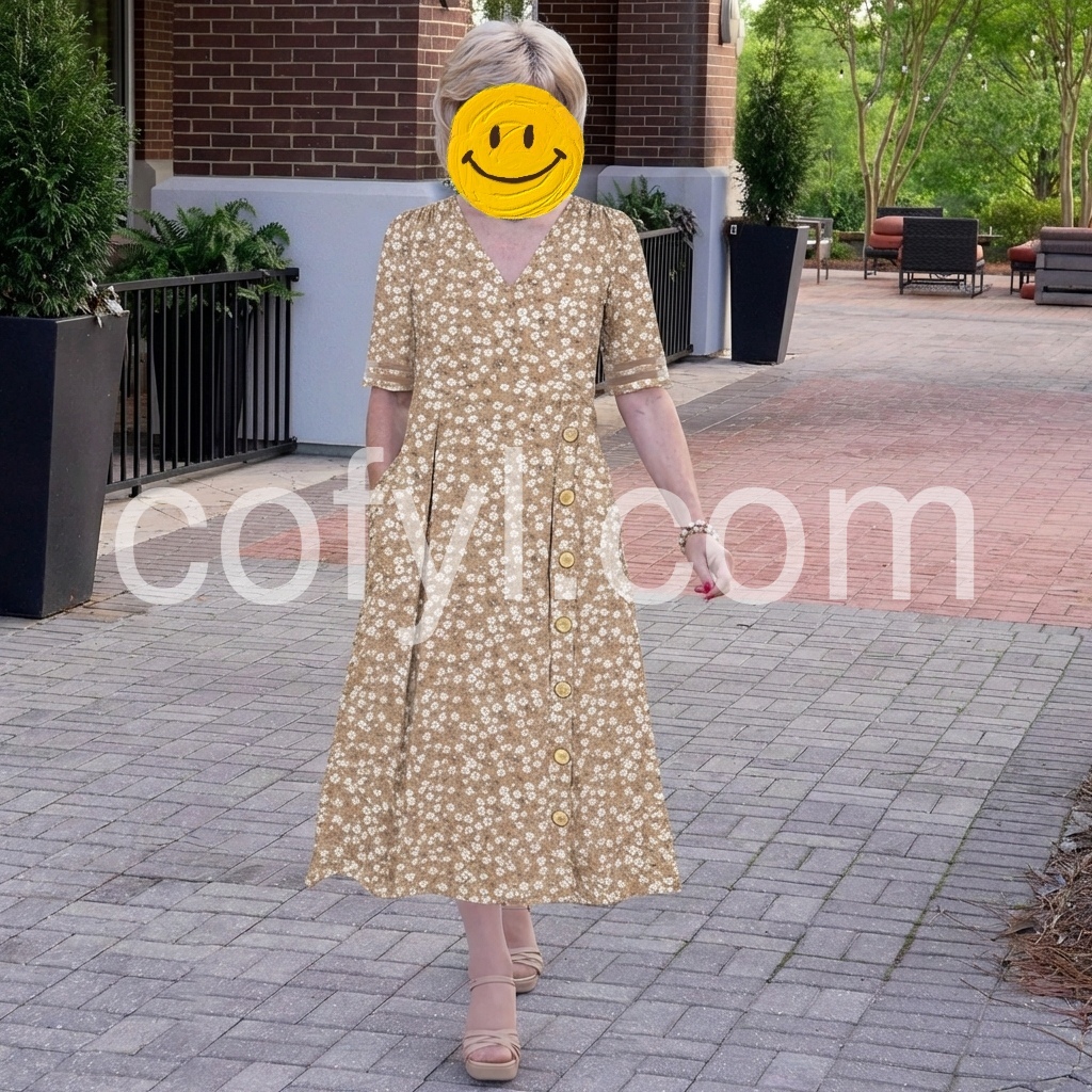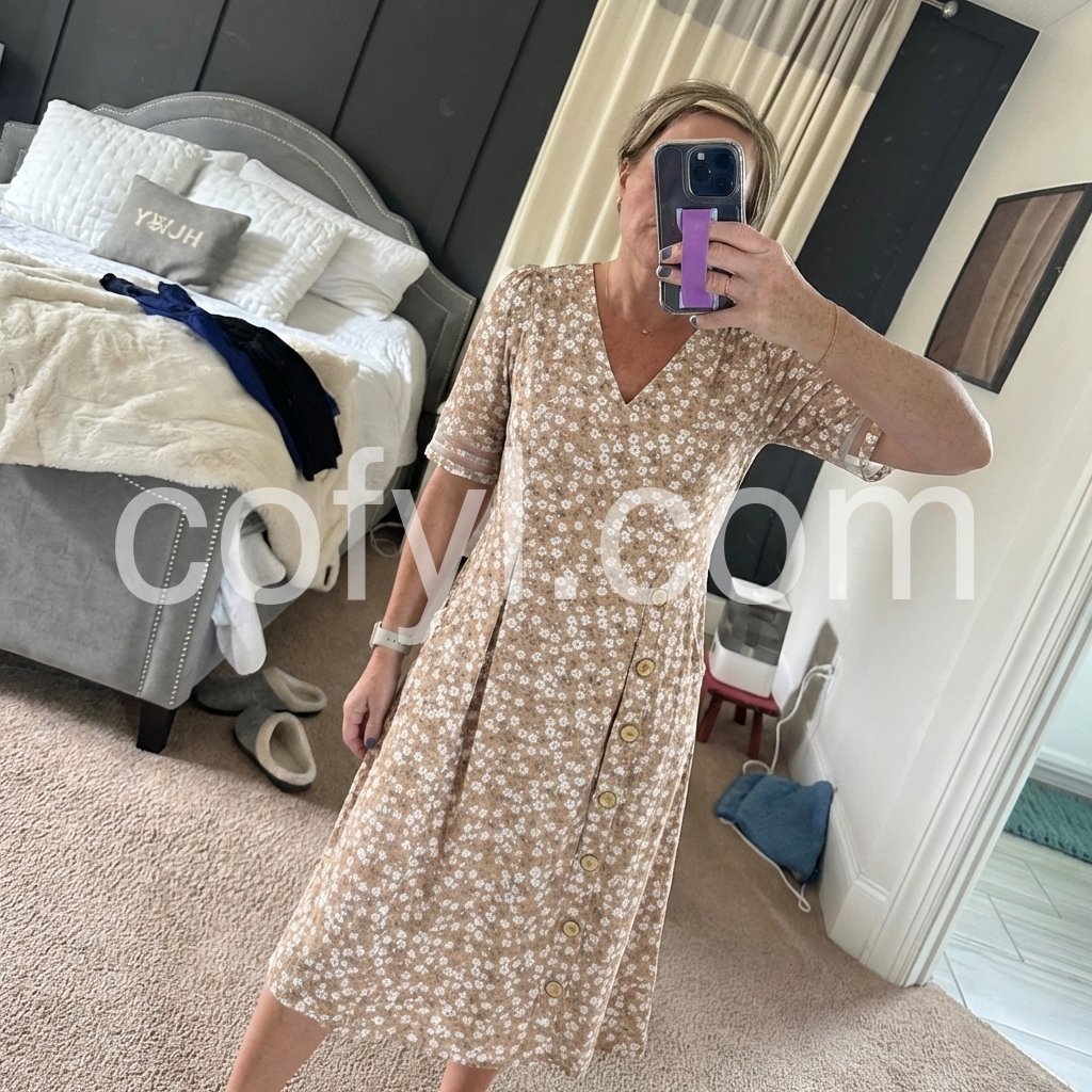The V-neck and button-up front give it a really cute, laid-back vibe, and the short sleeves make it ideal for warm weather. The floral pattern is vibrant without being over the top, and it pairs great with sandals for a casual day out or can be dressed up with accessories for dinner. She’s worn it to brunch, beach walks, and even a summer wedding—it’s that versatile.Comfortable, breathable, and super flattering.