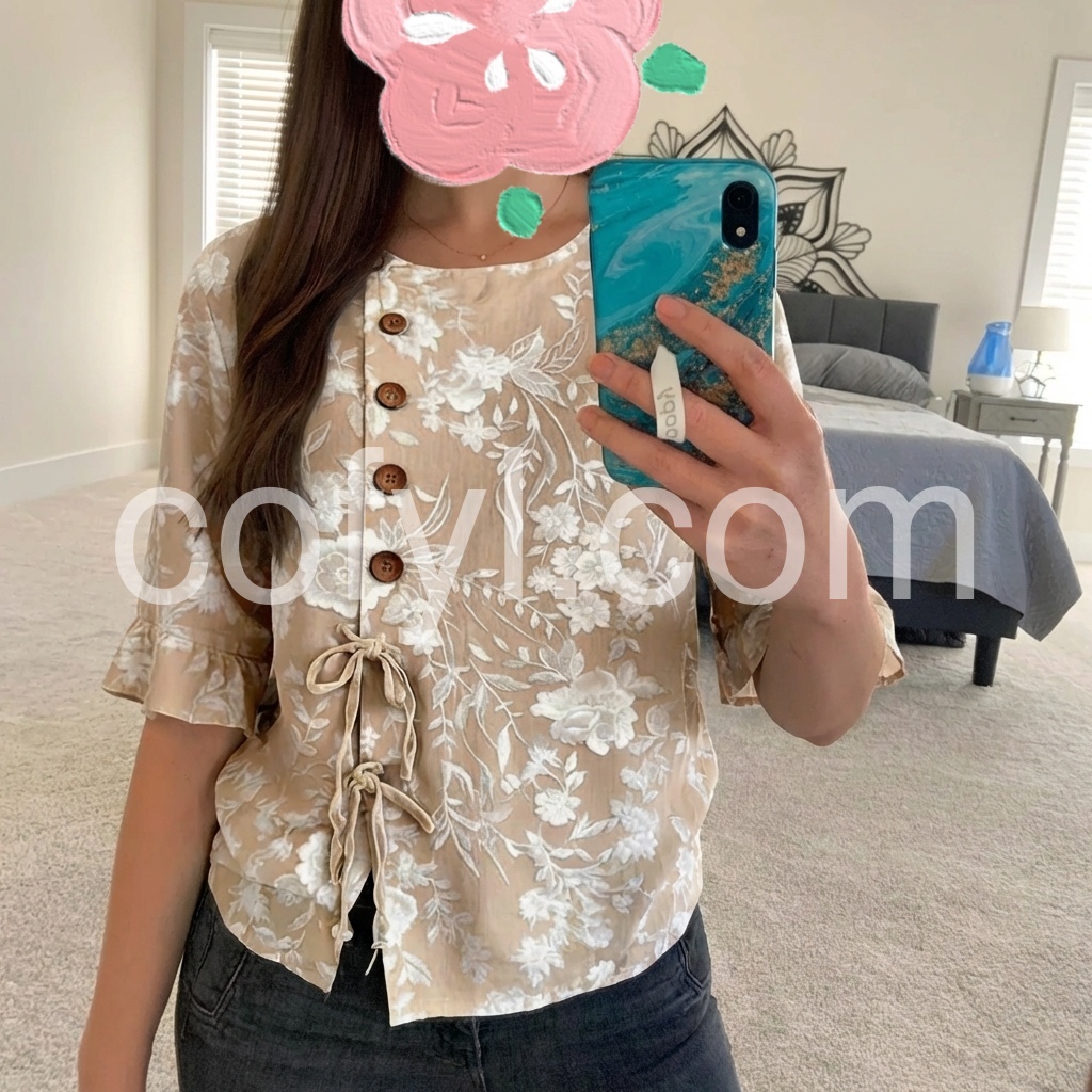 This loose-fitting top features a delicate white floral print on a beige background. Round neckline with wooden buttons and side tie detail. Three-quarter sleeves with ruffled cuffs for a feminine touch. Lightweight and breathable, perfect for casual wear. Ideal paired with jeans or pants.