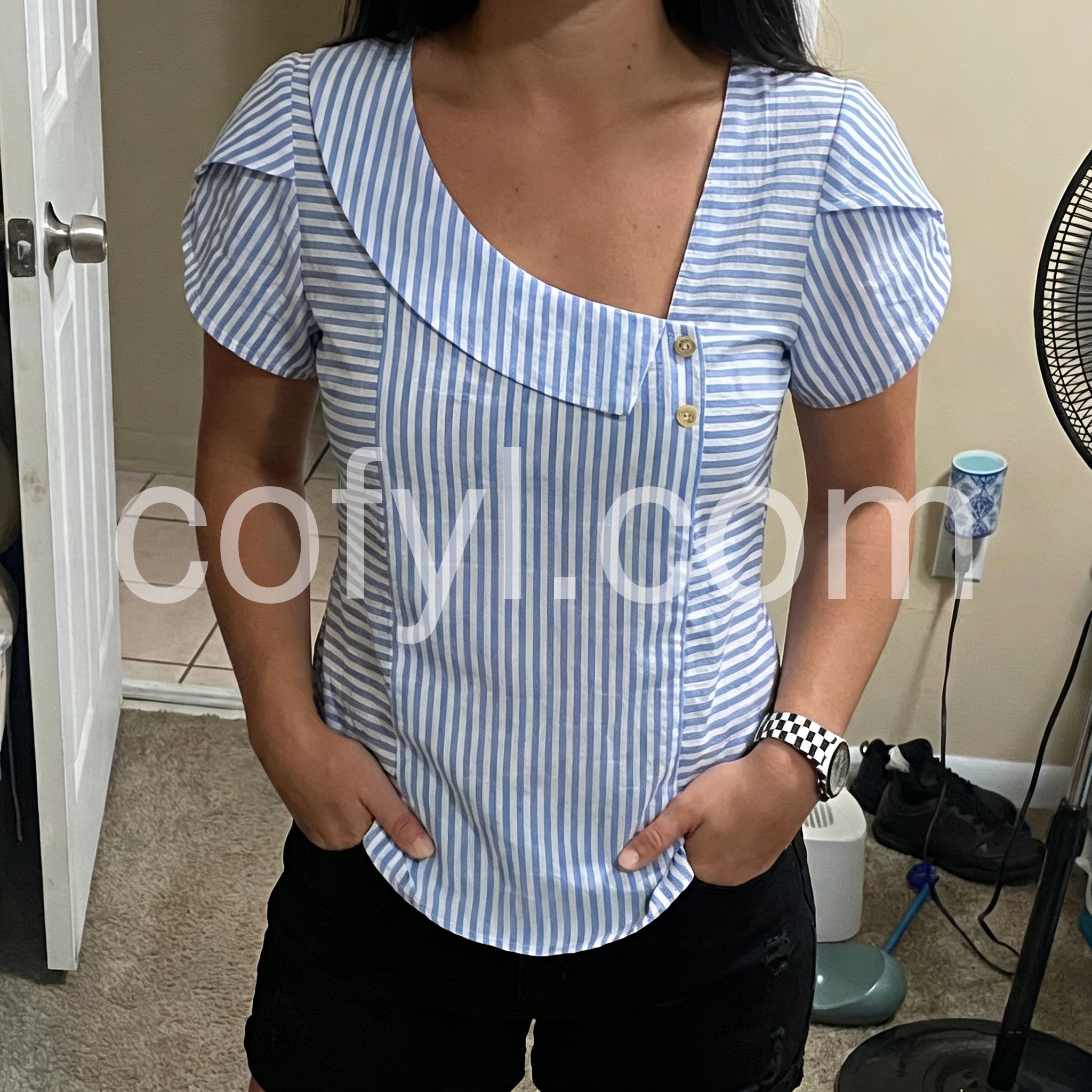 I absolutely love the unique neckline on this top! The asymmetrical collar with the little buttons adds such a cute touch to a classic striped shirt. It fits perfectly and looks great with my denim shorts. Highly recommend for summer!