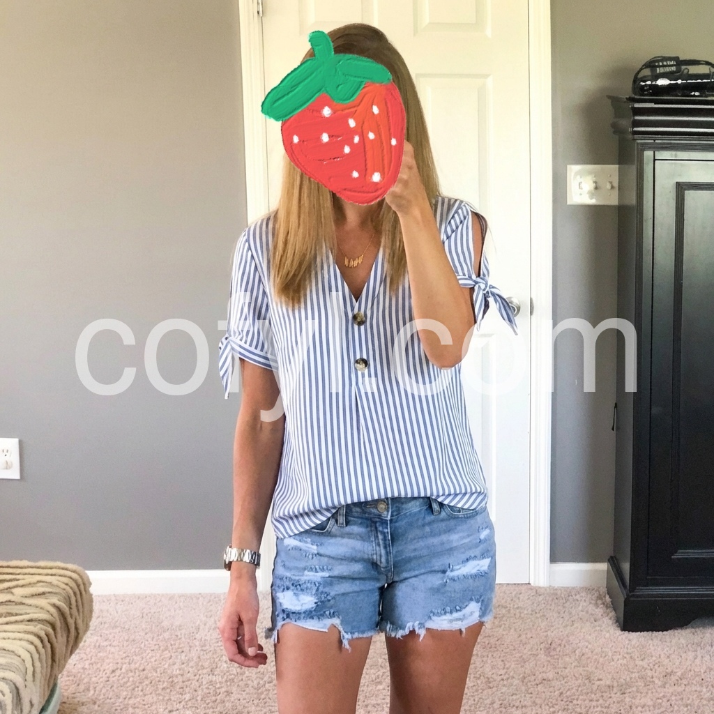 Absolutely love this top! The vertical stripes are so flattering and the little ties on the sleeves add such a cute detail. It fits perfectly and looks great with jeans. Very lightweight and perfect for summer.