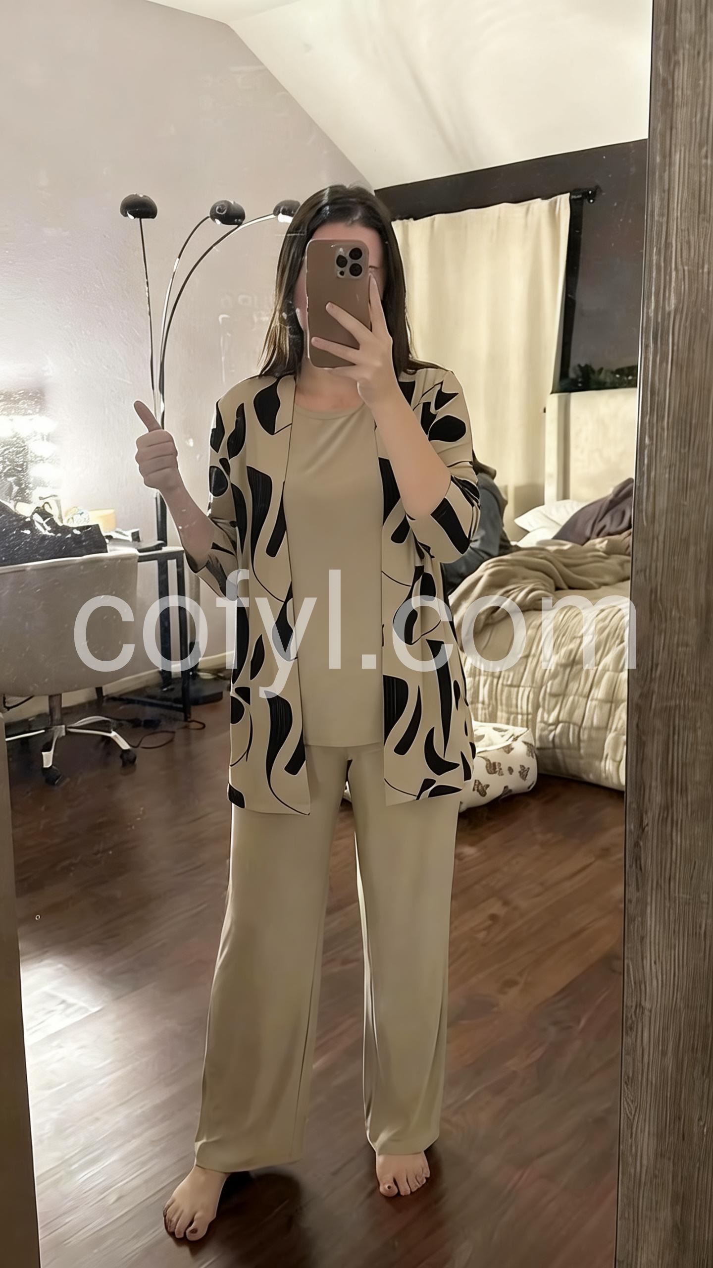 This coordinated set includes a round-neck top, relaxed wide-leg pants, and a matching open-front cardigan in soft brown tones. Made from comfortable, lightweight fabric ideal for everyday wear. The minimalist design offers effortless elegance. Perfect for casual outings or relaxed days at home. Stylish, versatile, and easy to layer.