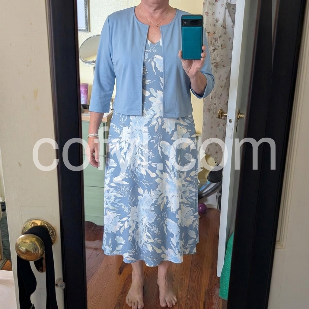 This dress features a flowing midi length with soft blue floral print. Paired with a matching short sleeve jacket for a polished look. V-neckline and side pockets add comfort and style. Lightweight fabric perfect for warm days. Ideal for casual outings or garden events.