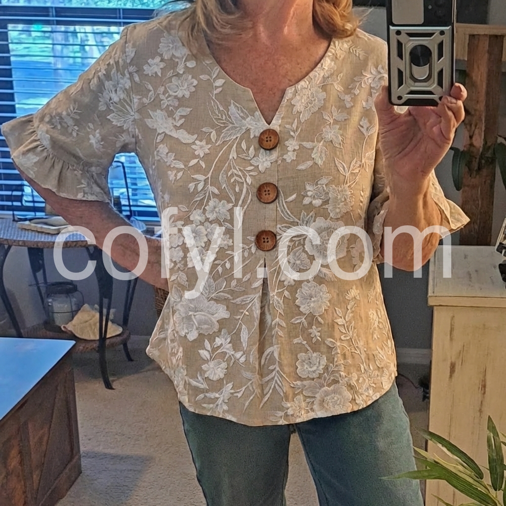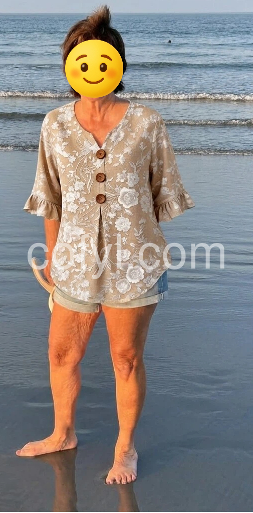 This V-neck top features delicate white floral Print on a soft beige base. Front button closure with wooden buttons and flared ruffle sleeves. Lightweight fabric perfect for warm days. Relaxed fit with a feminine touch. Ideal for casual wear or resort style.